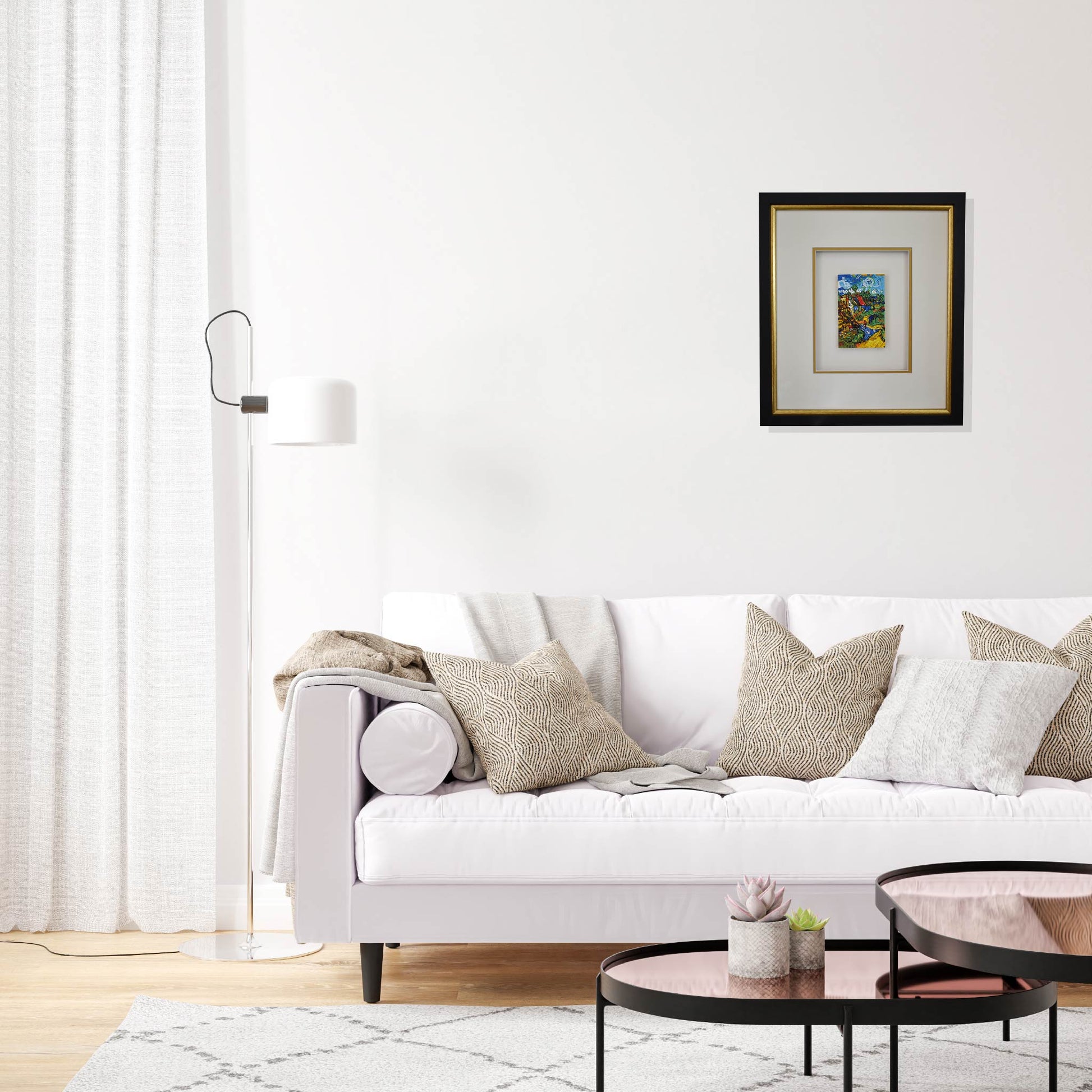 A black wooden frame with two layers of passe-partout adds depth to the artwork and is protected by UV-resistant glass. This glass serves as a barrier, deflecting or absorbing UV radiation to preserve the integrity of the artwork.