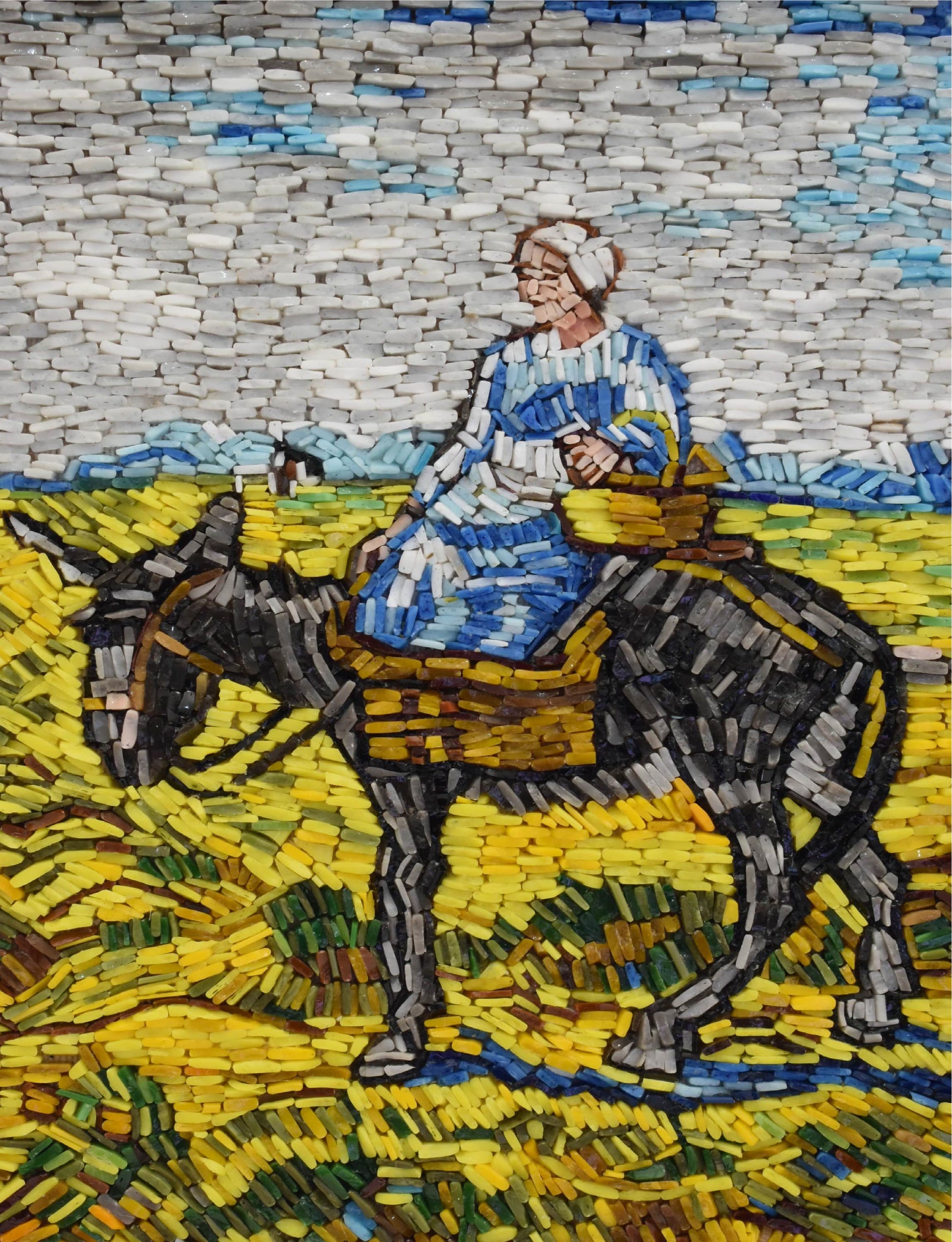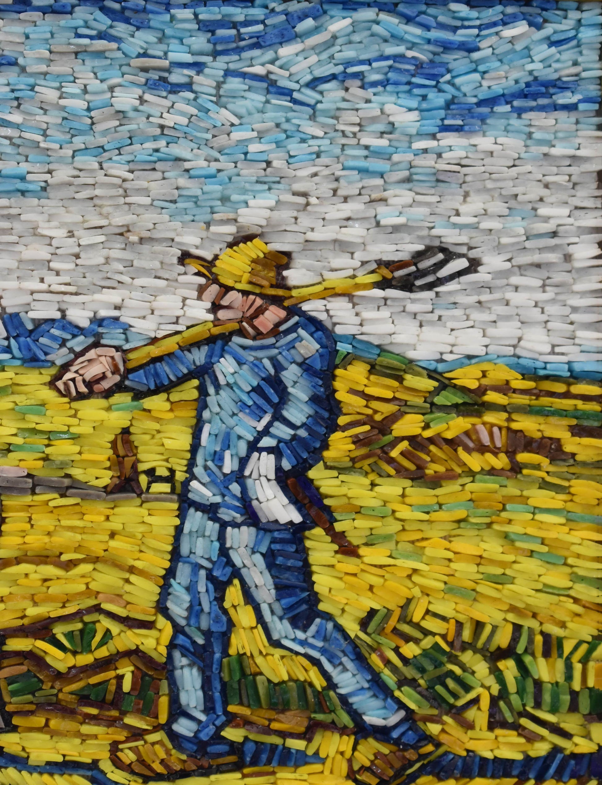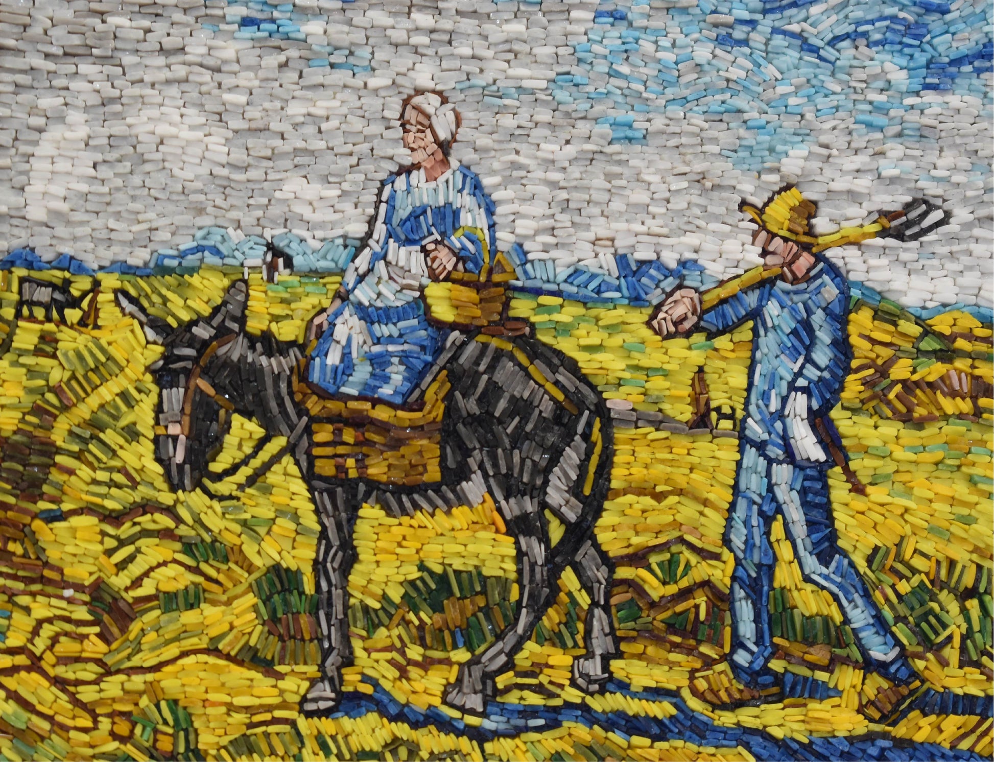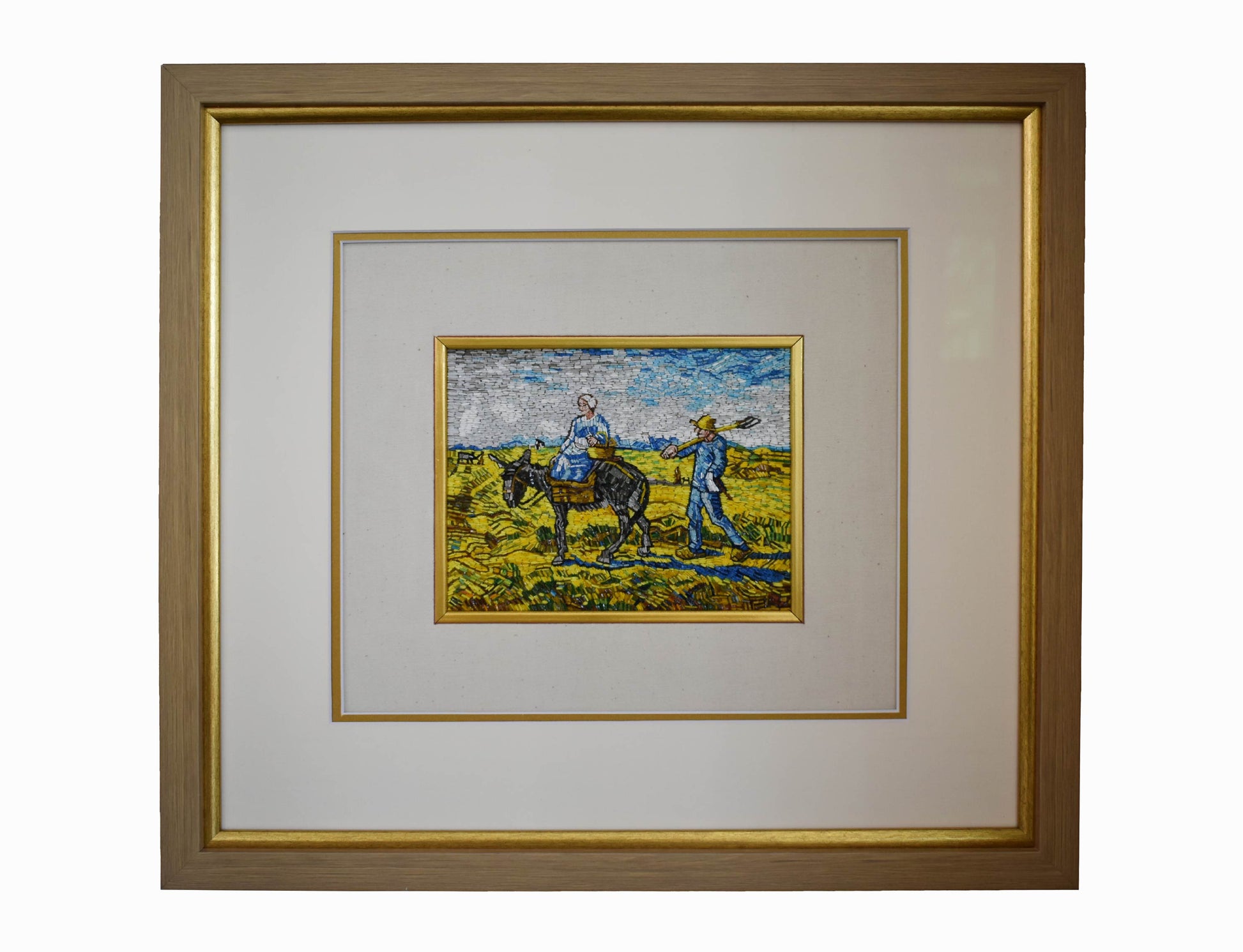 Vincent van Gogh's 'Morning, Going to Work' is a painting of laborers heading to work across a field, bathed in the gentle light of morning. It captures the dignity and beauty of everyday life and Van Gogh's empathetic connection to the human experience. Our micro mosaic recreation captures the essence of Van Gogh's painting in intricate detail, inviting you to immerse yourself in the serene morning scene and celebrate the spirit of the laborers and the artist's profound perspective.