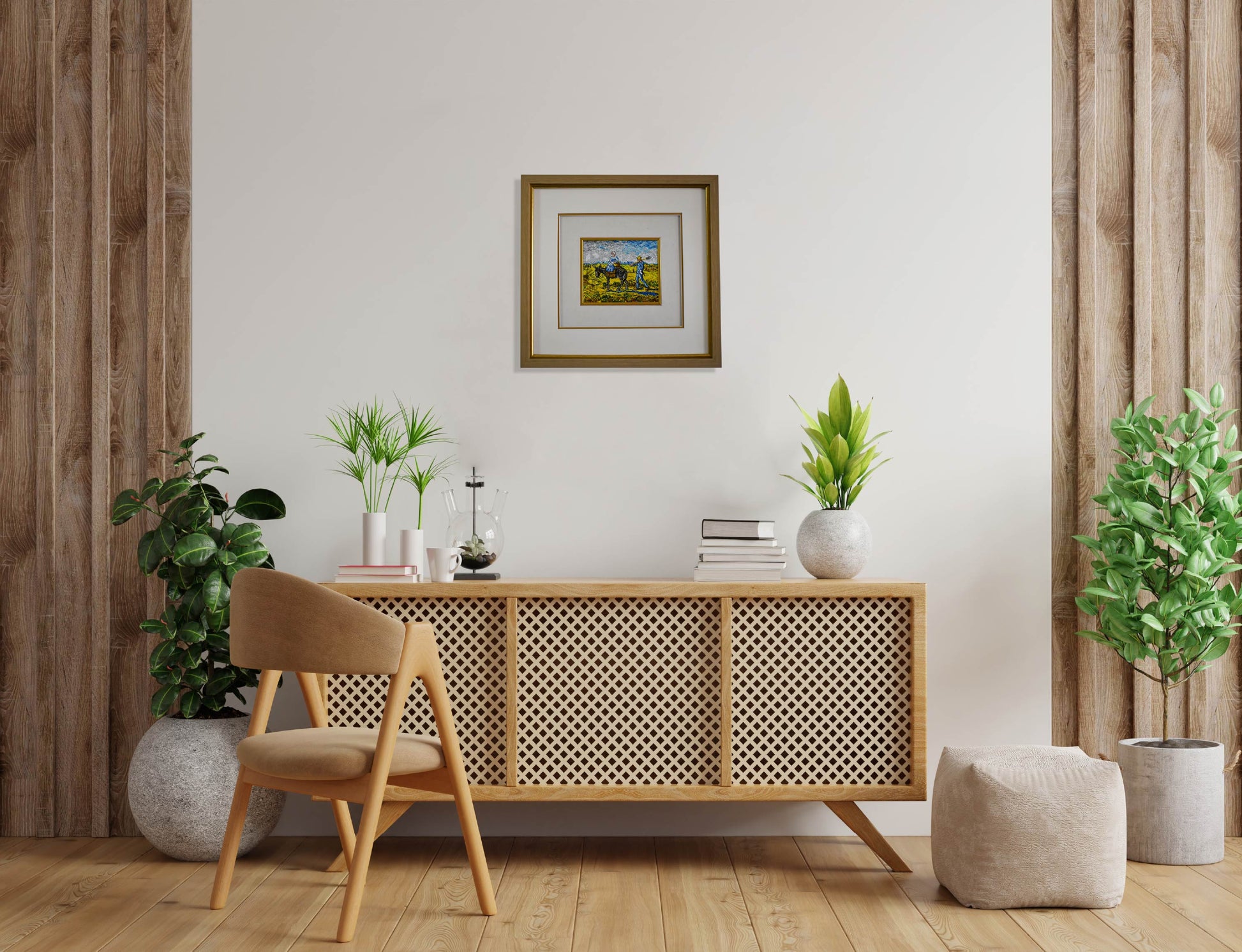 A wooden frame with two layers of passe-partout adds depth to the artwork and is protected by UV-resistant glass. This glass serves as a barrier, deflecting or absorbing UV radiation to preserve the integrity of the artwork.