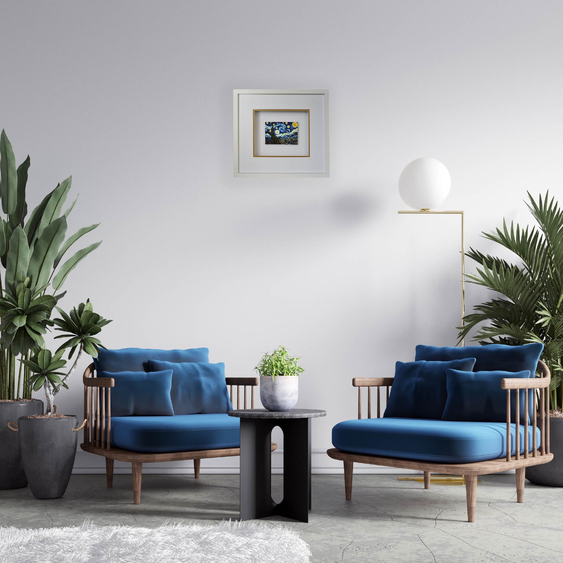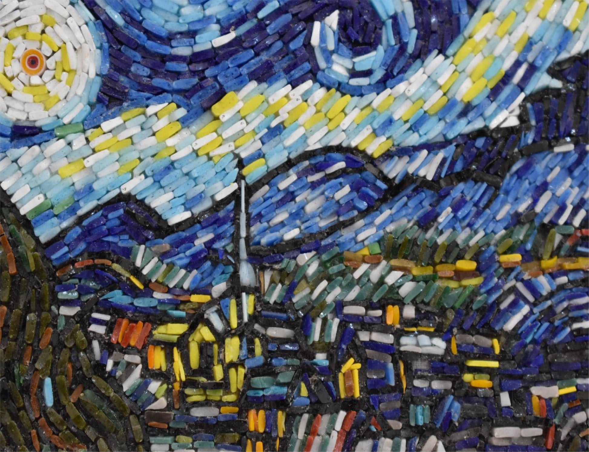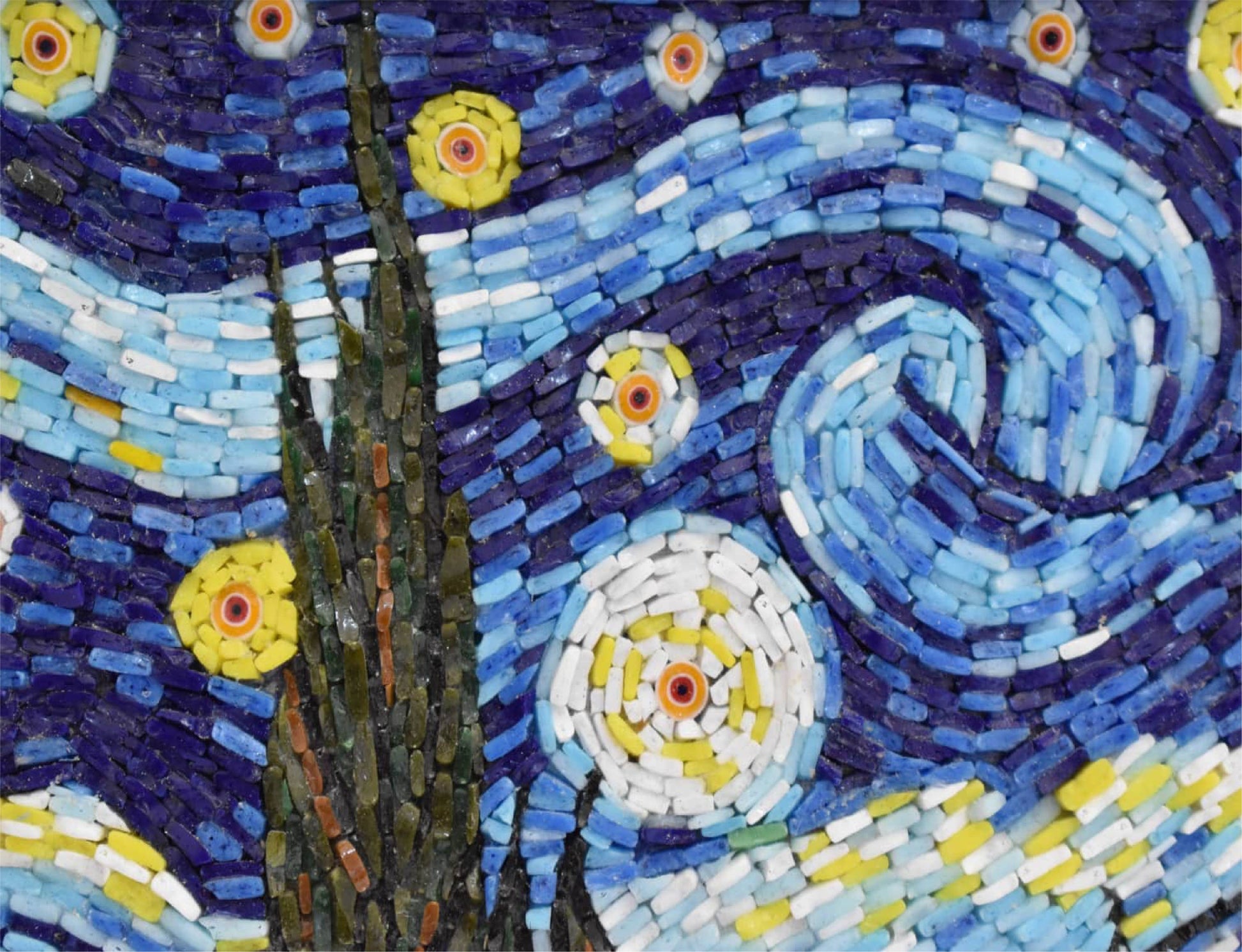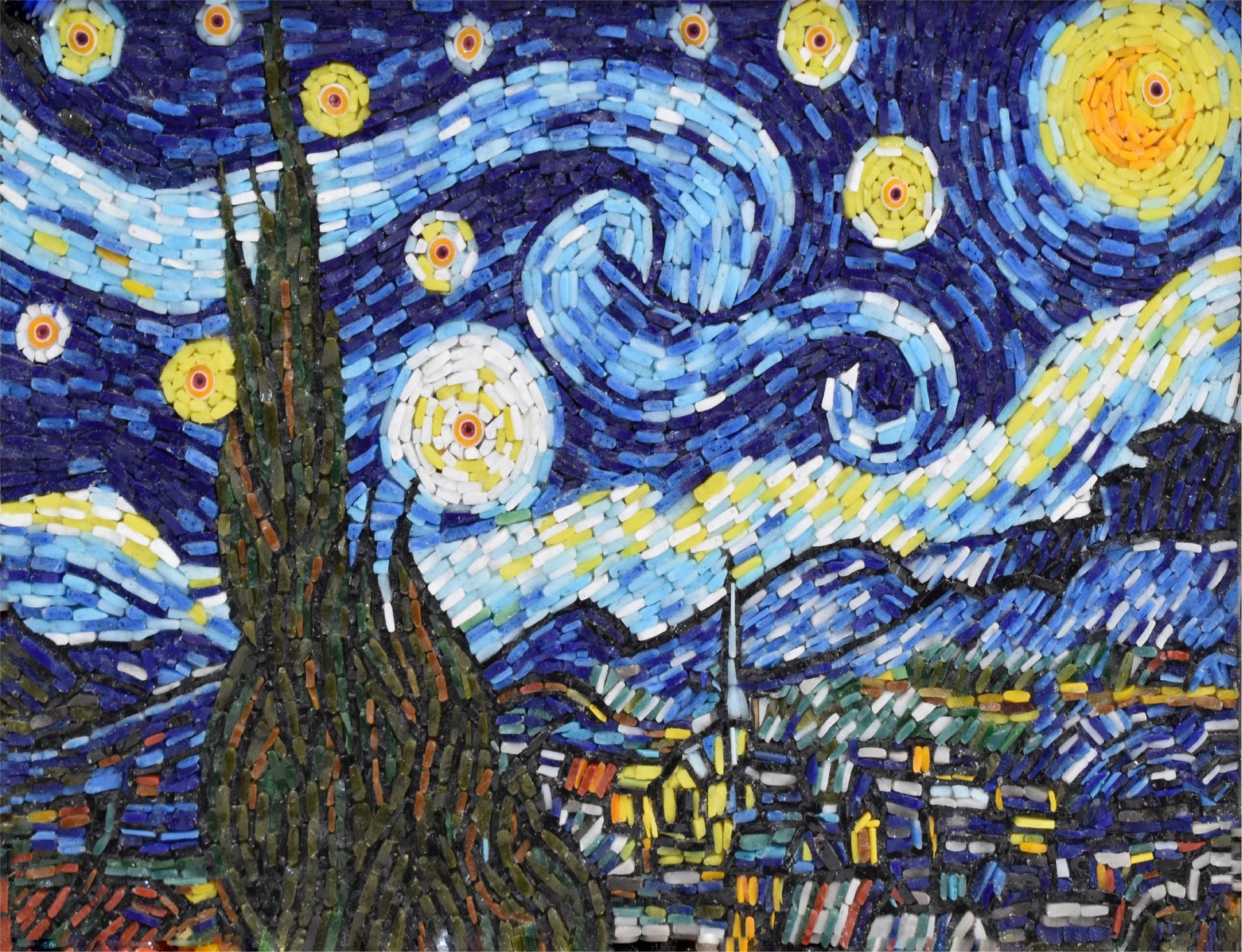 Vincent van Gogh's "Starry Night" is a famous masterpiece that depicts a swirling night sky over a village with cypress trees. It's believed to reflect both his mental state and the view from his window. Despite its intensity, the painting also exudes beauty and wonder. It remains an iconic work, captivating audiences with its mesmerizing beauty and emotional depth. Our micro mosaic recreation captures the emotional intensity and dynamic beauty of the original, transporting you to the serene yet vivid world of the night sky and village, echoing Van Gogh's inner experiences.